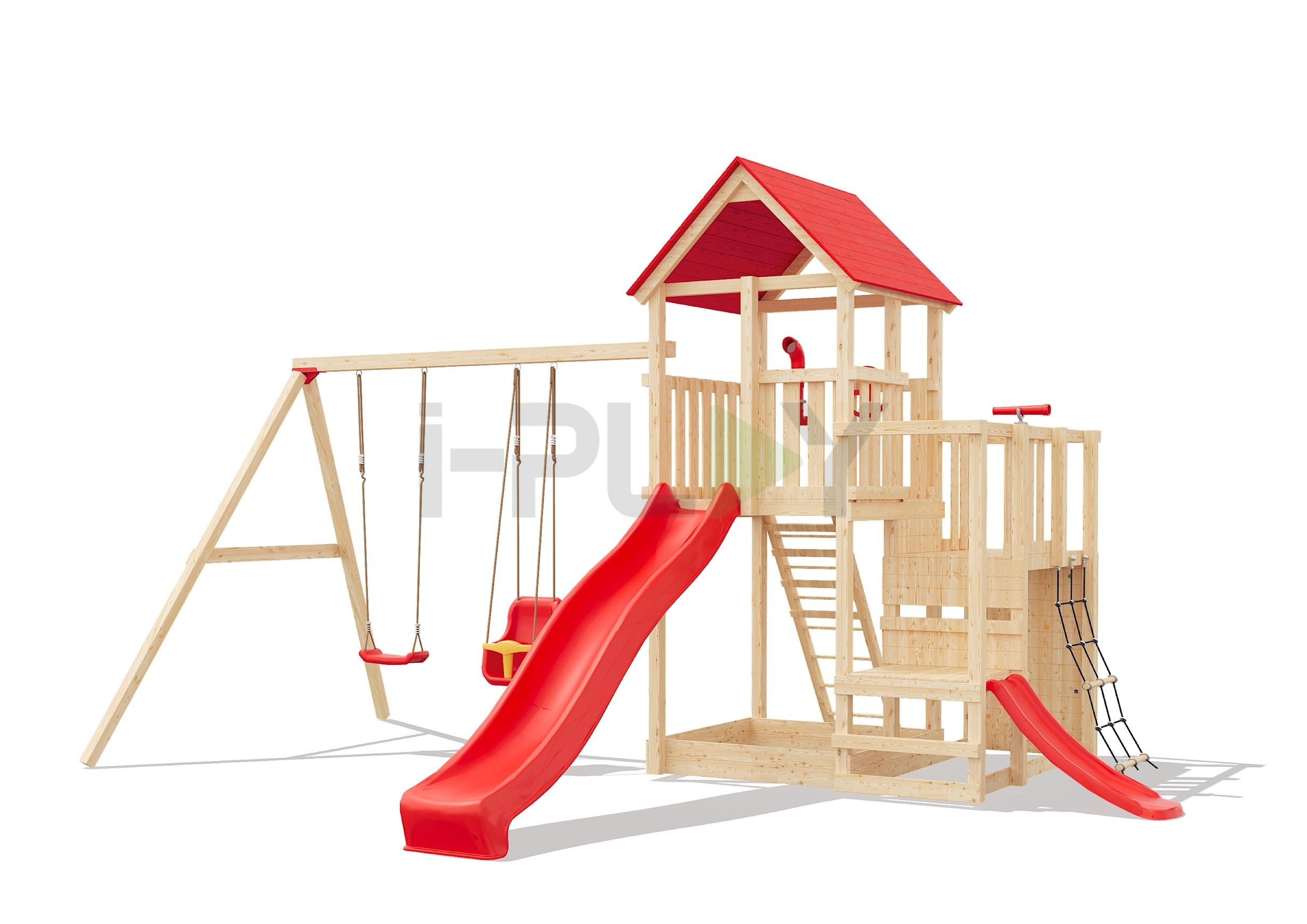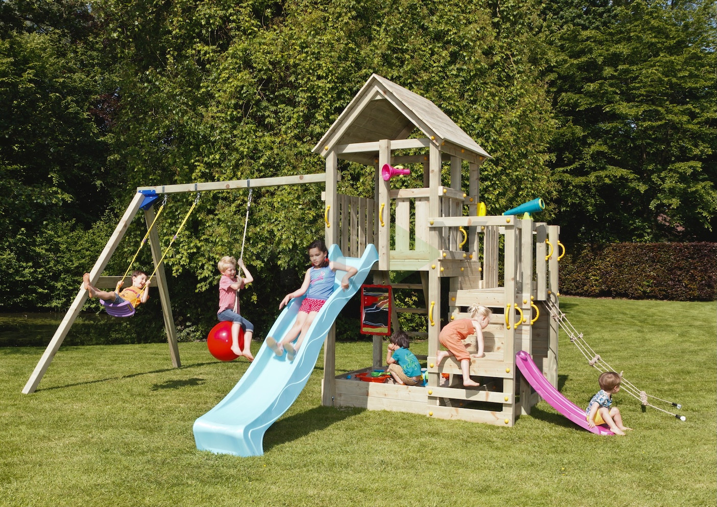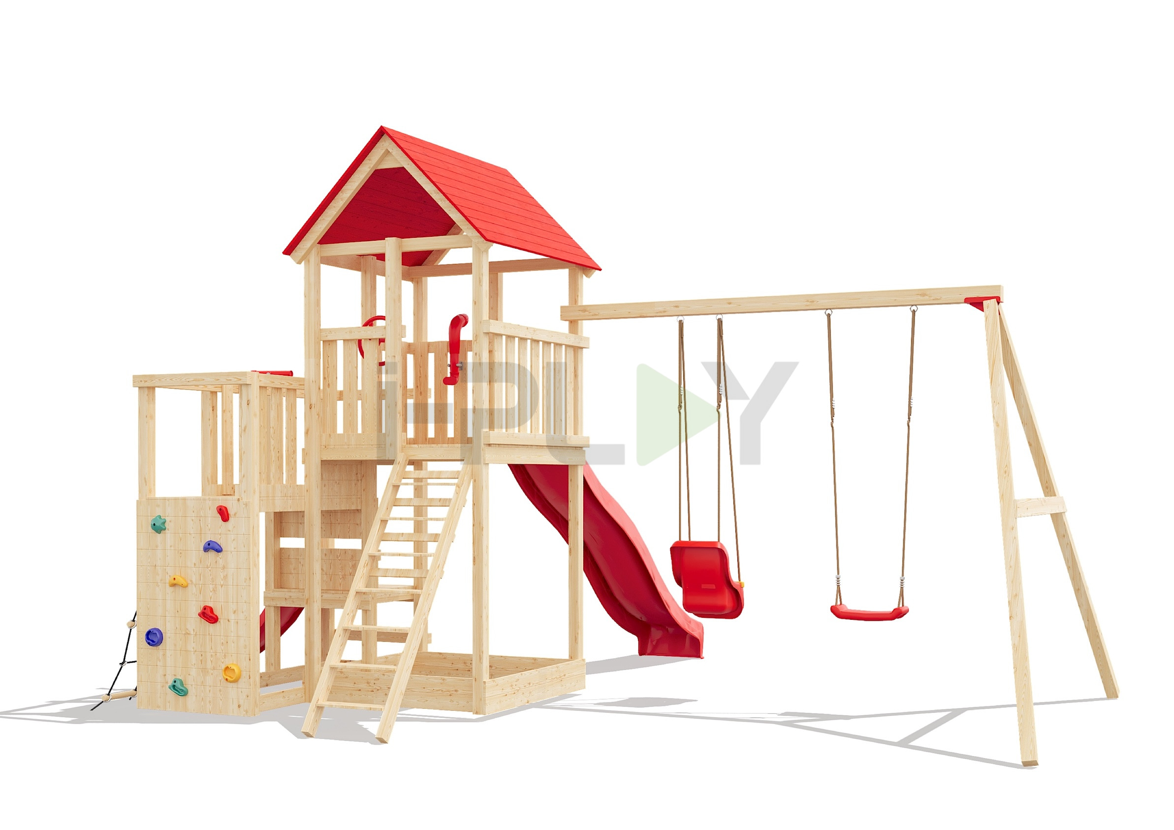 Базовая комплектация: башня, качельный модуль, лестница, скалодром, горка, качели