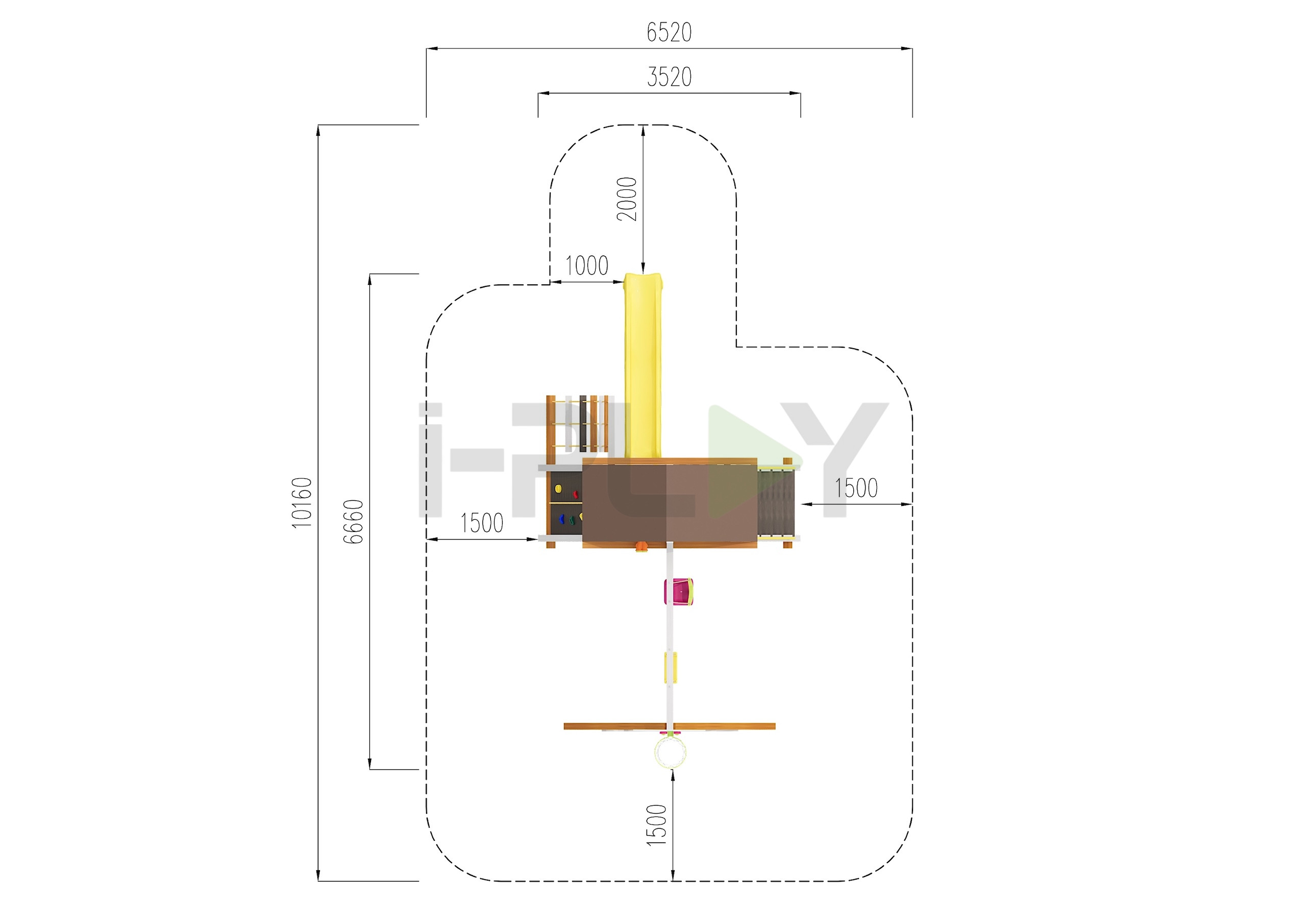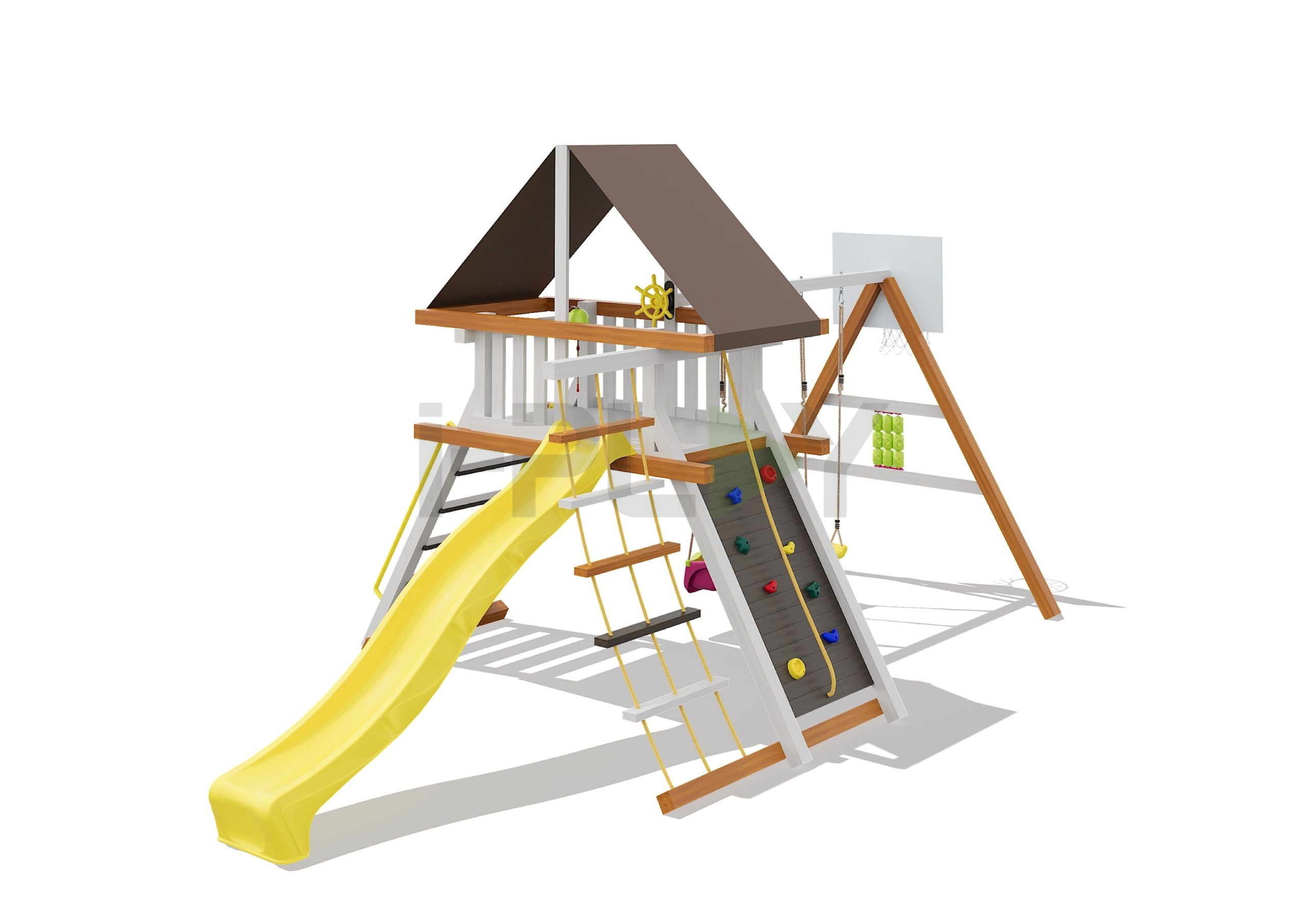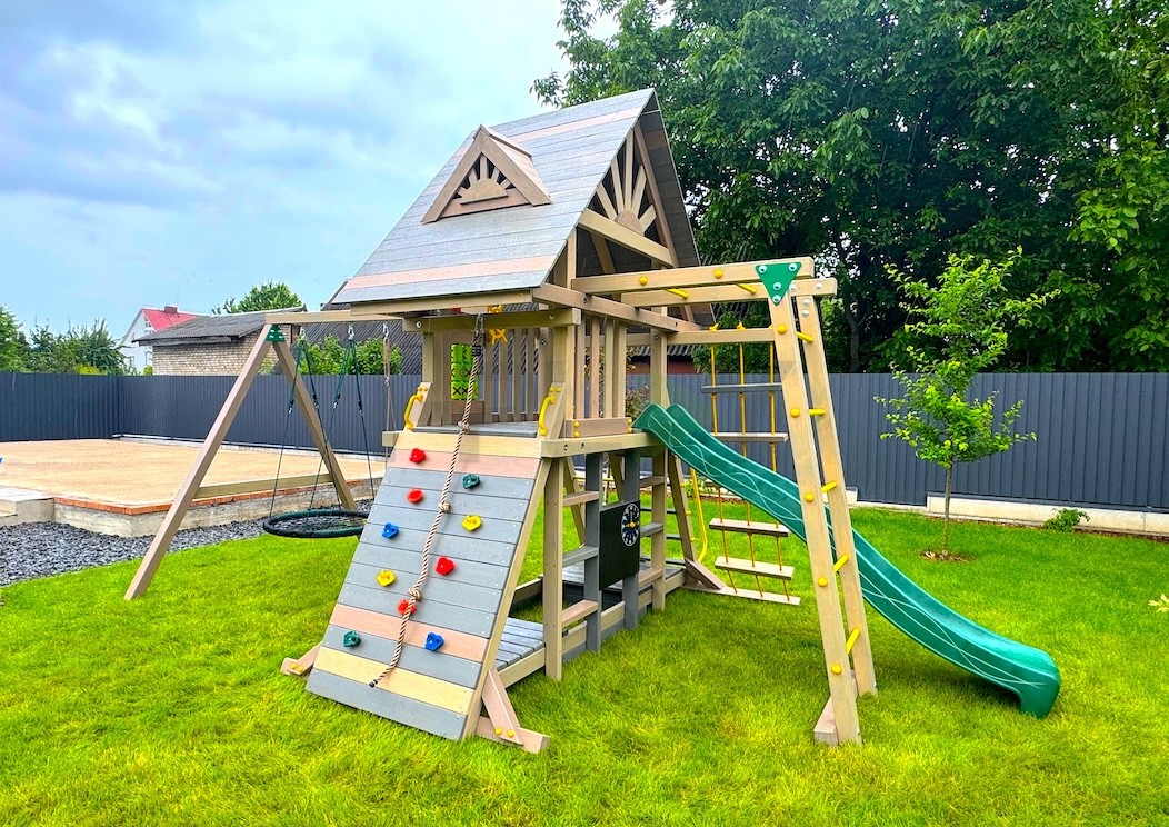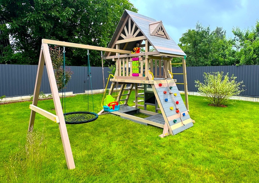 Базовая комплектация: башня, качельный модуль, лестница, канатная лестница, скалодром, горка, качели