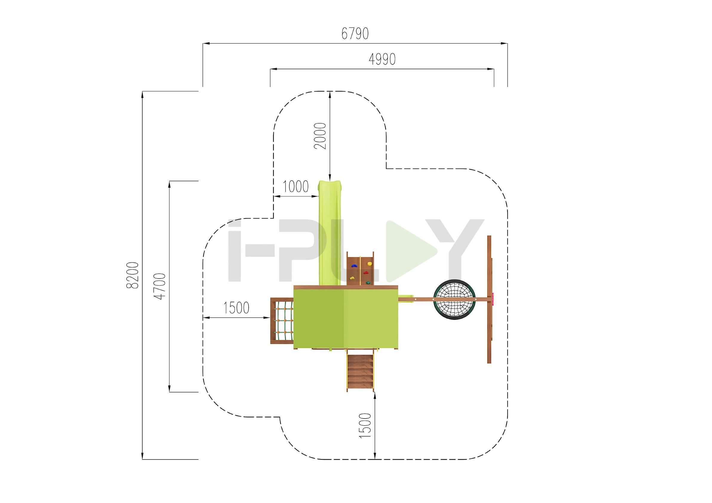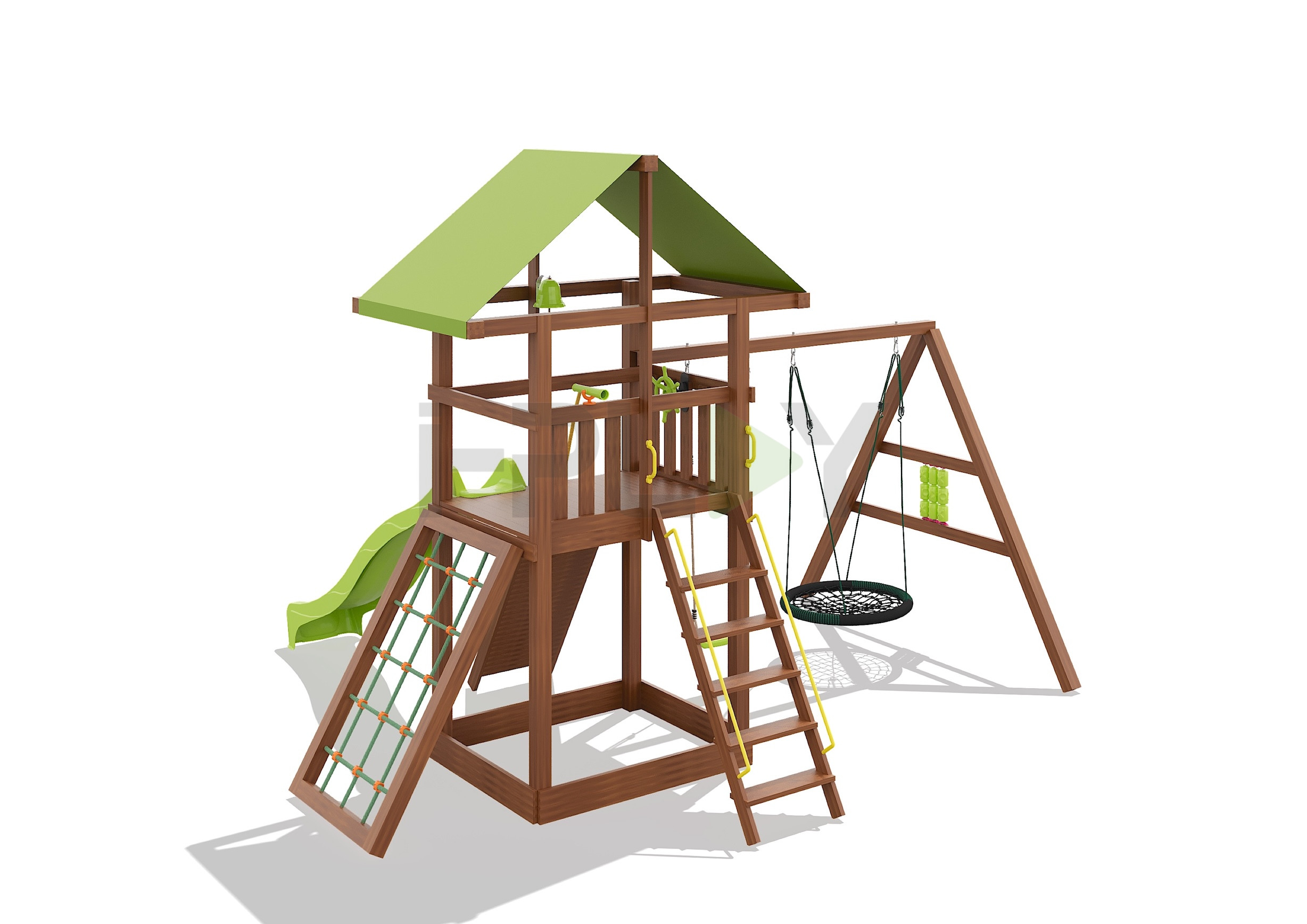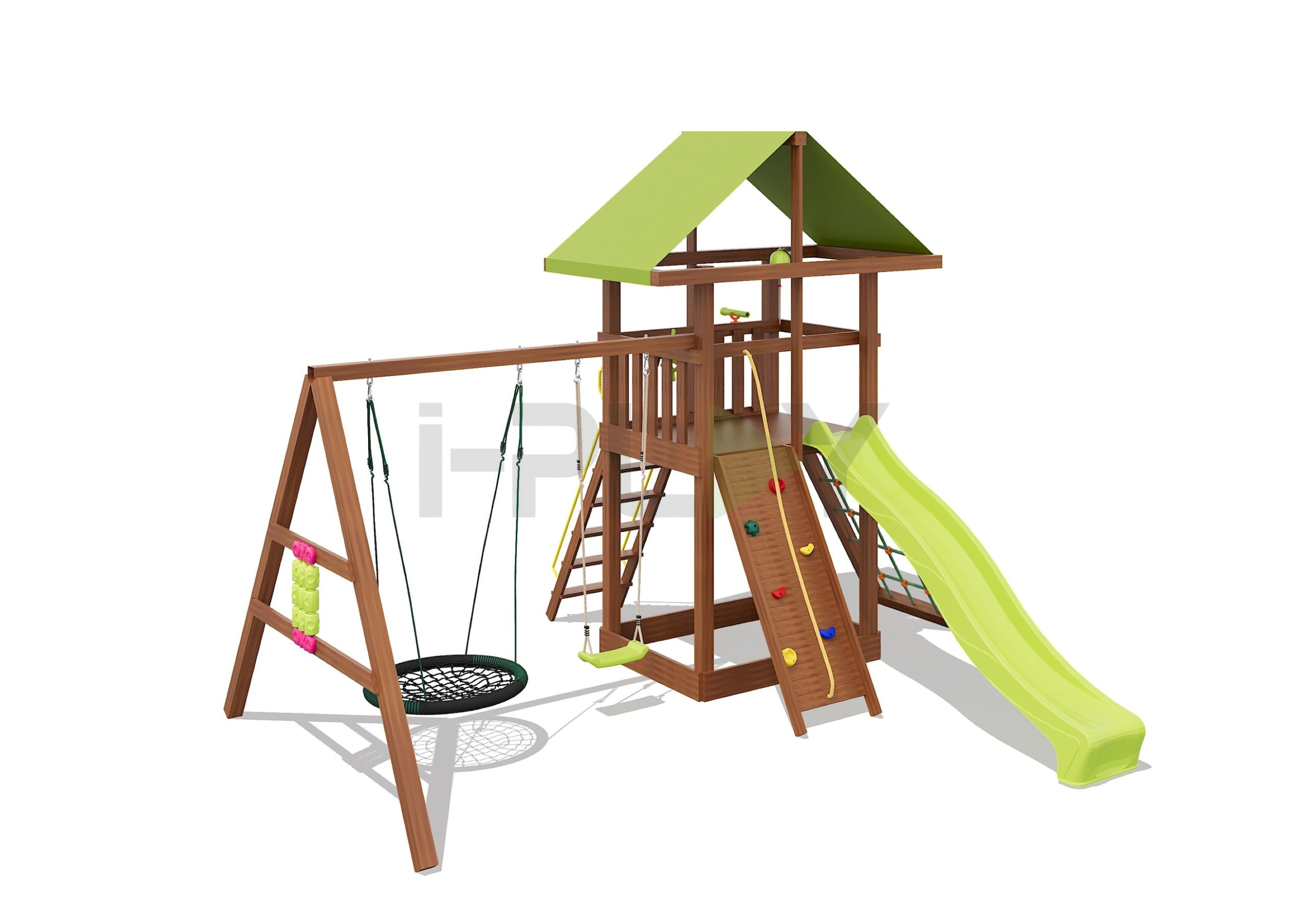 Базовая комплектация: башня, качельный модуль, лестница, канатная лестница, скалодром, горка, качели