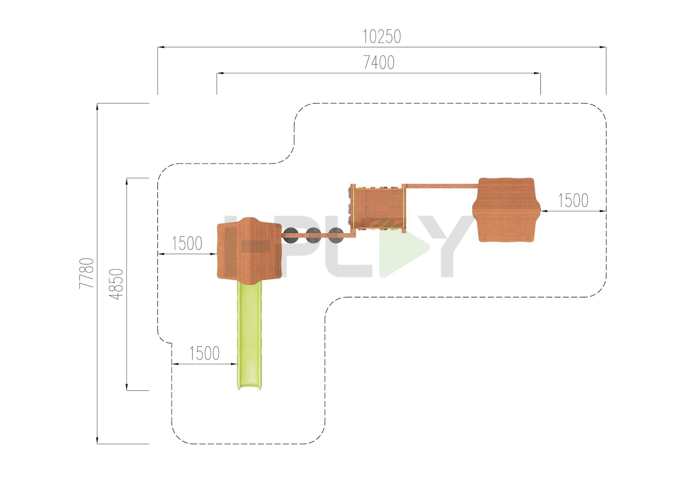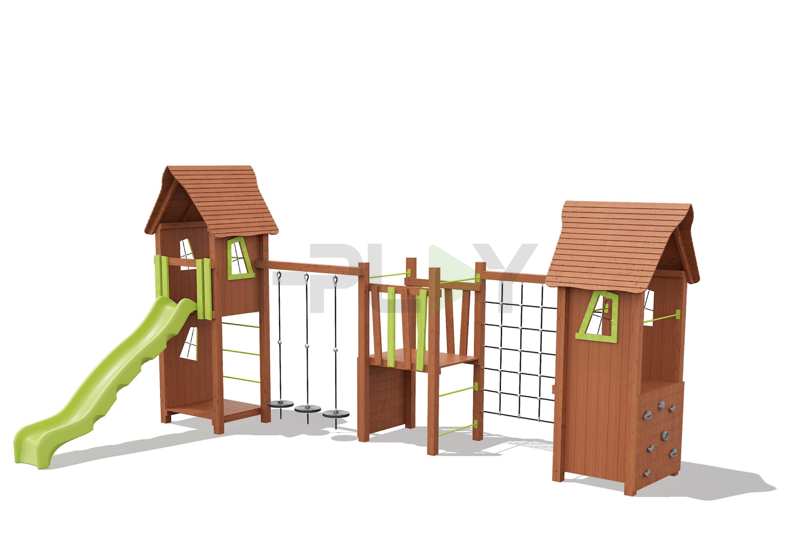 Дерево клееный брус сосна, двухслойная пропитка на водной основе. Горка пластик HDPE. Армированный канат.