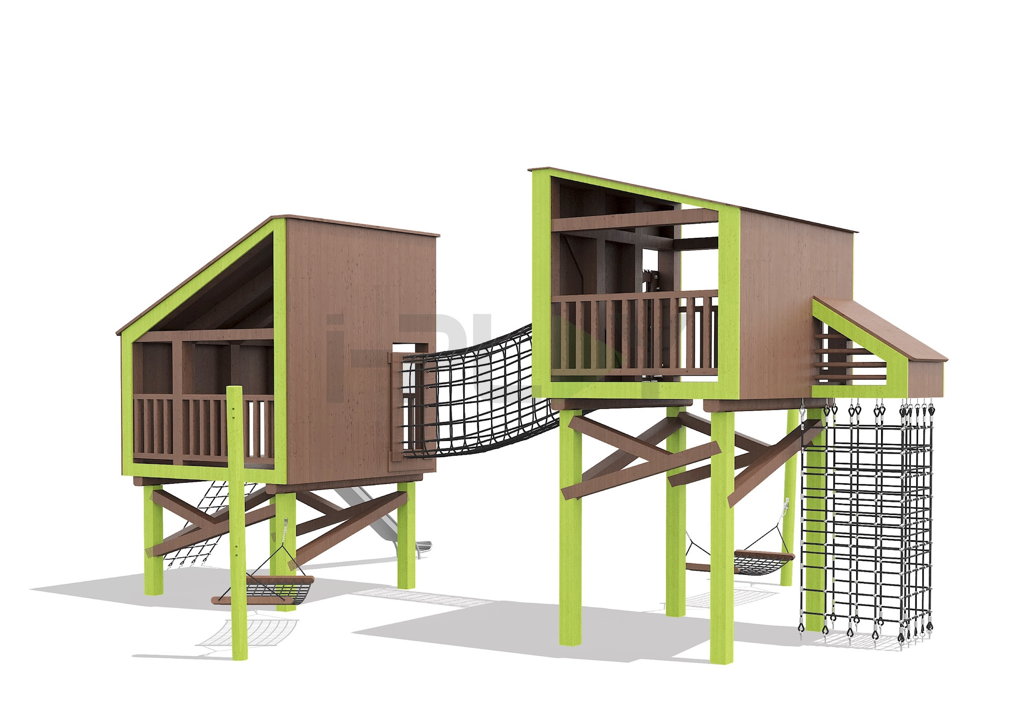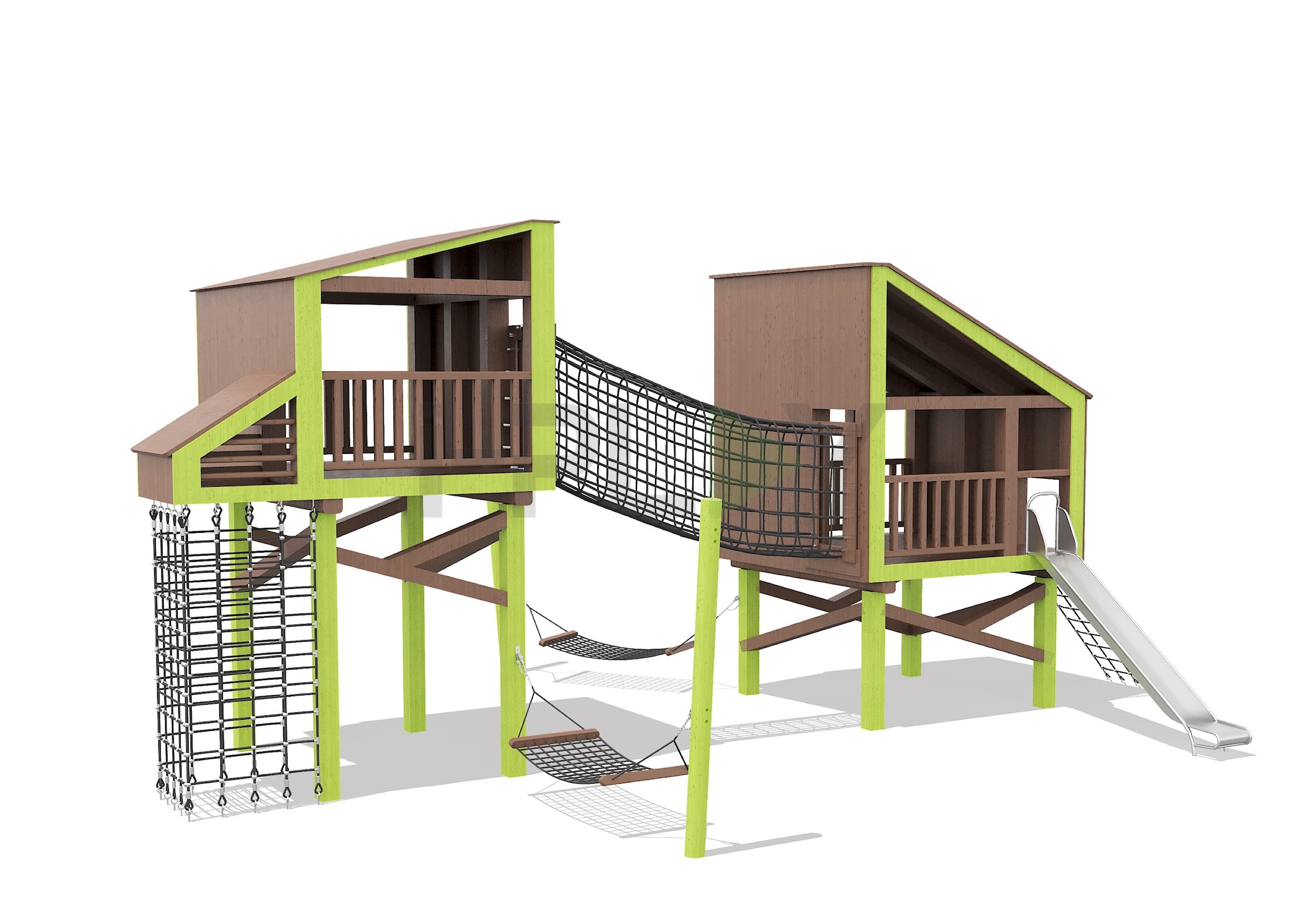 Дерево клееный брус сосна/лиственница, двухслойная пропитка на водной основе. Горка нержавеющая сталь. Армированный канат.