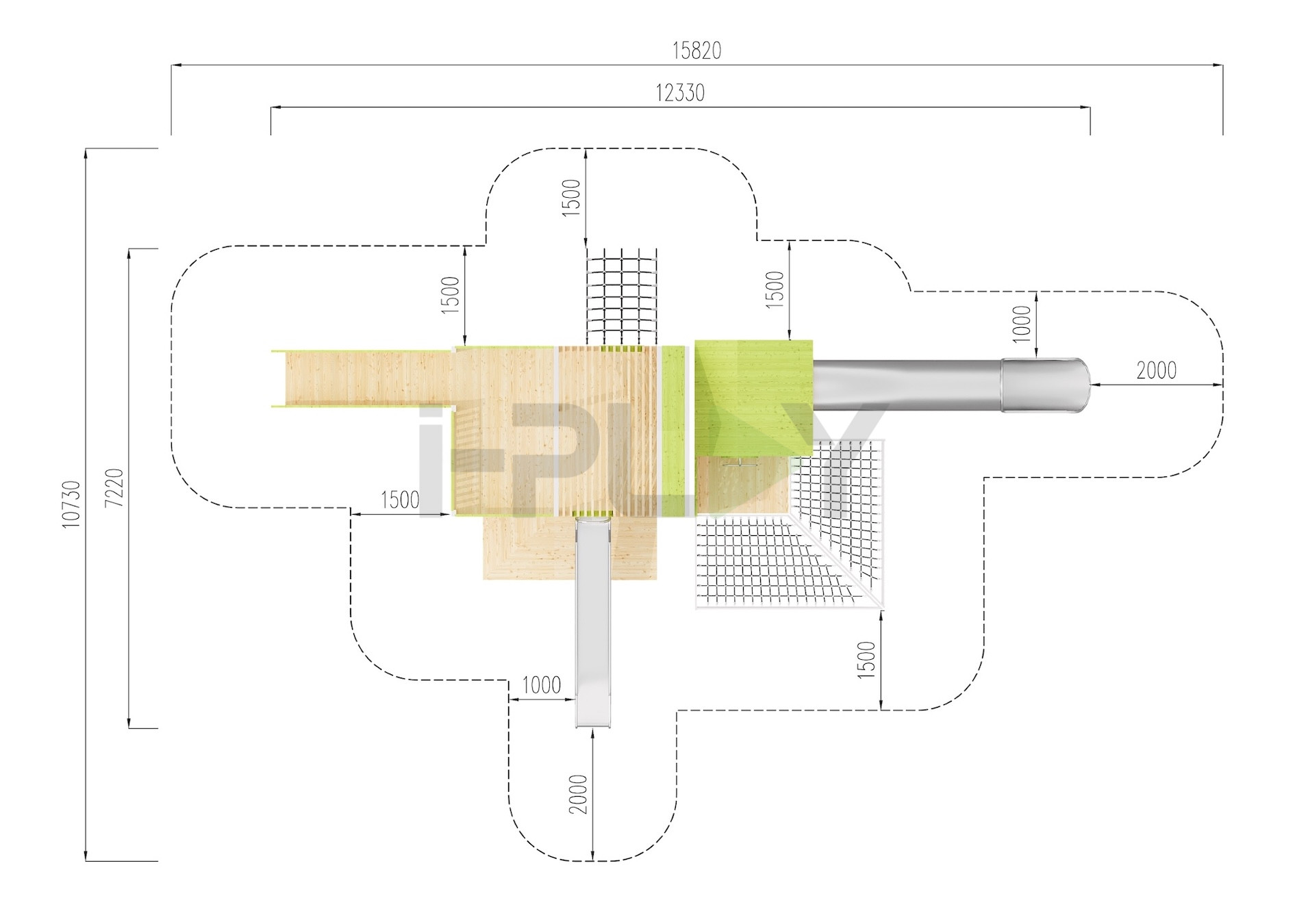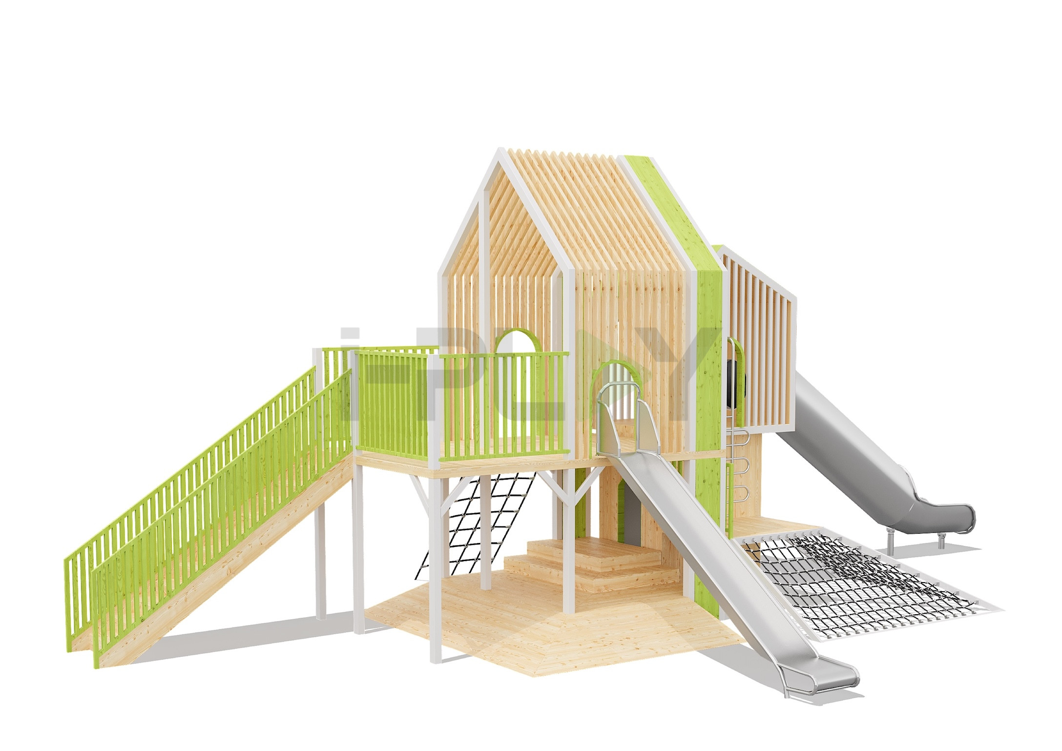 Дерево клееный брус сосна/лиственница, двухслойная пропитка на водной основе. Горки нержавеющая сталь. Армированный канат.