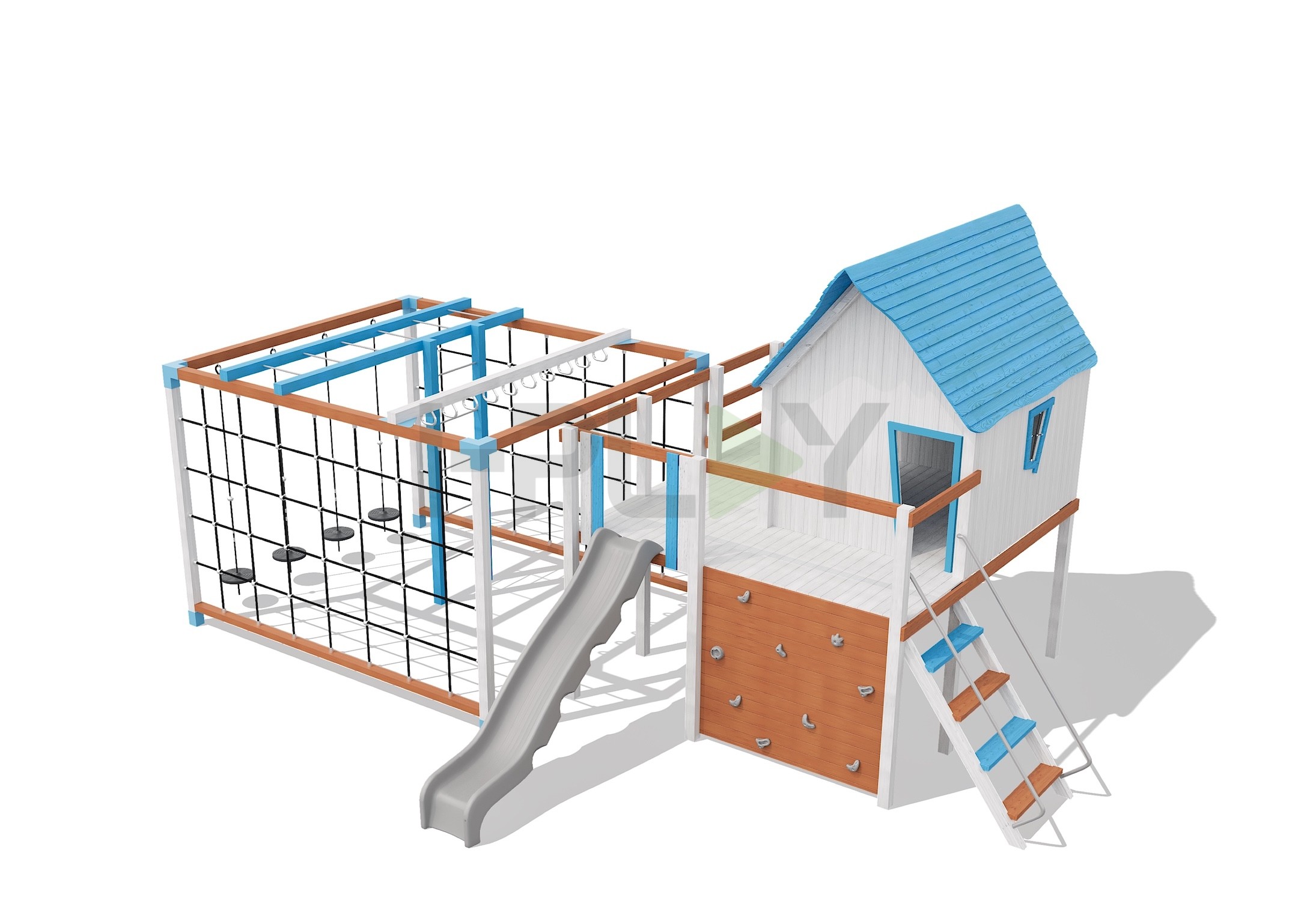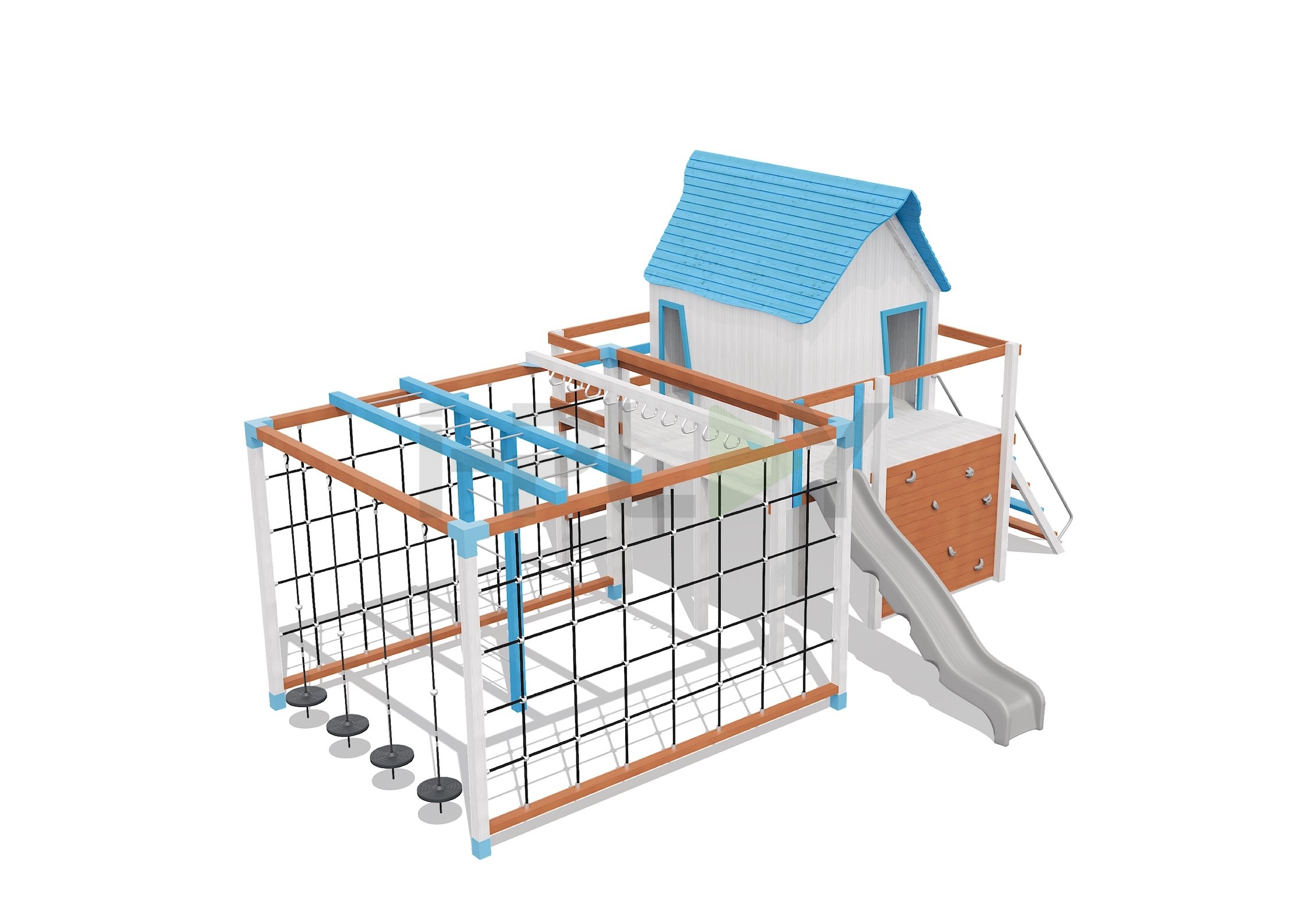 Дерево клееный брус сосна, двухслойная пропитка на водной основе. Горка пластик HDPE. Армированный канат.