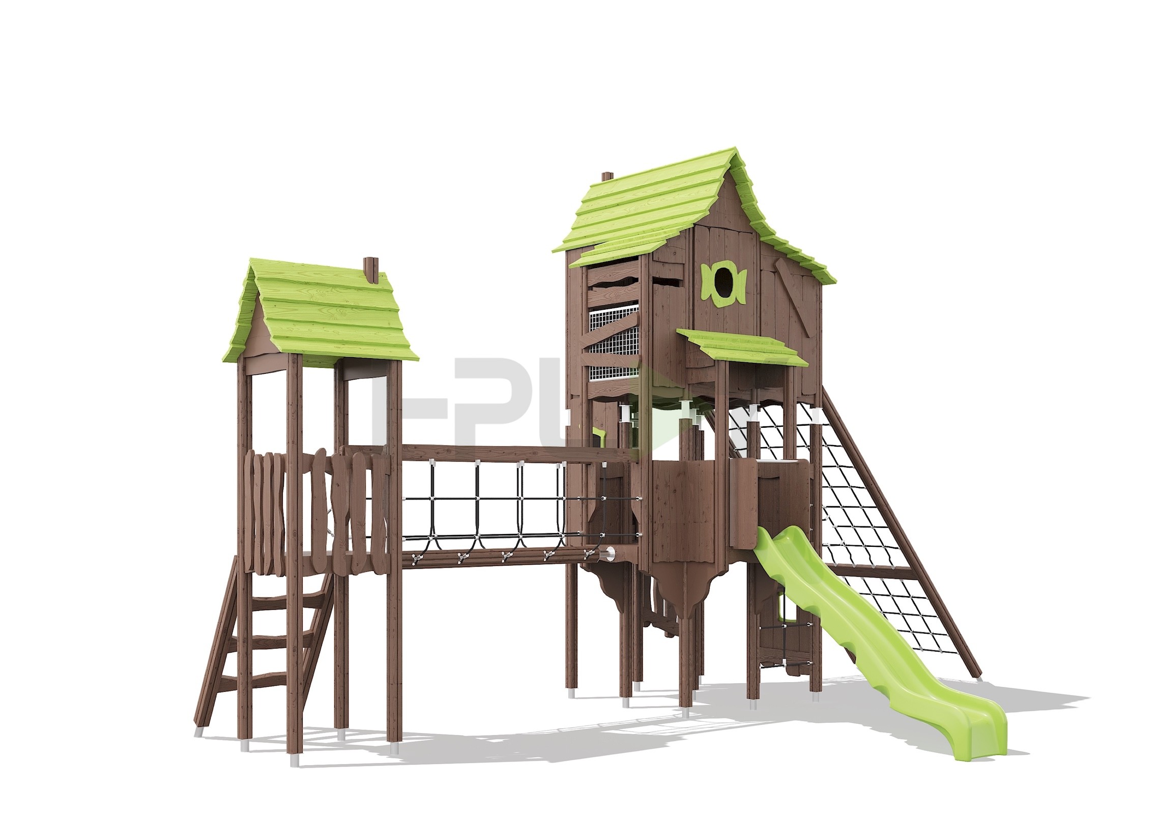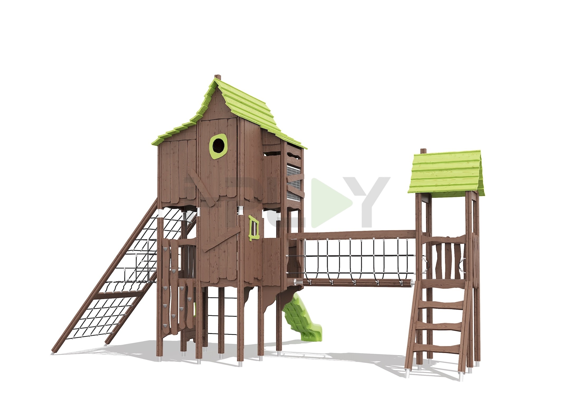 Дерево клееный брус сосна, двухслойная пропитка на водной основе. Горка пластик HDPE. Армированный канат.