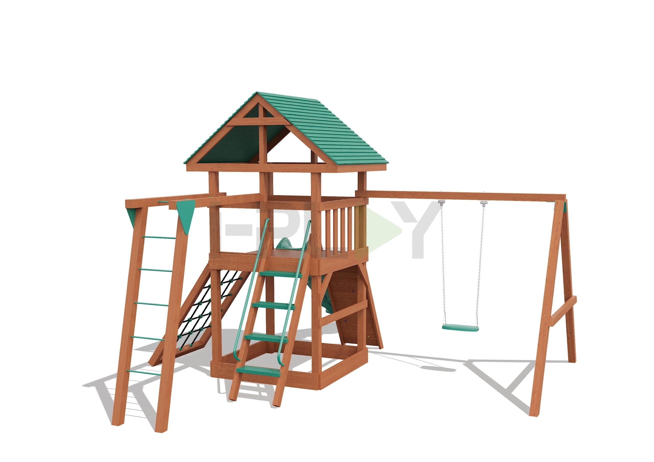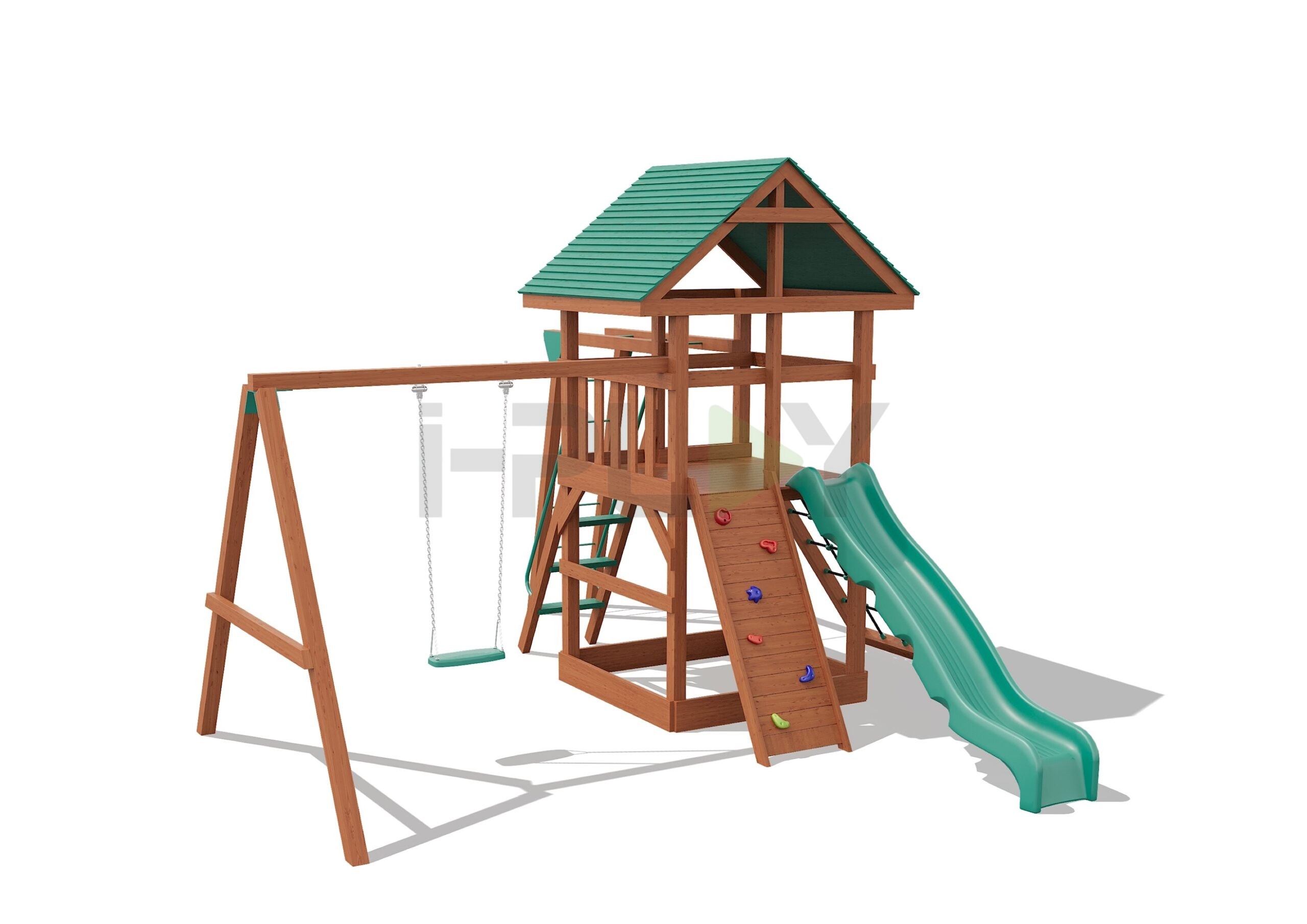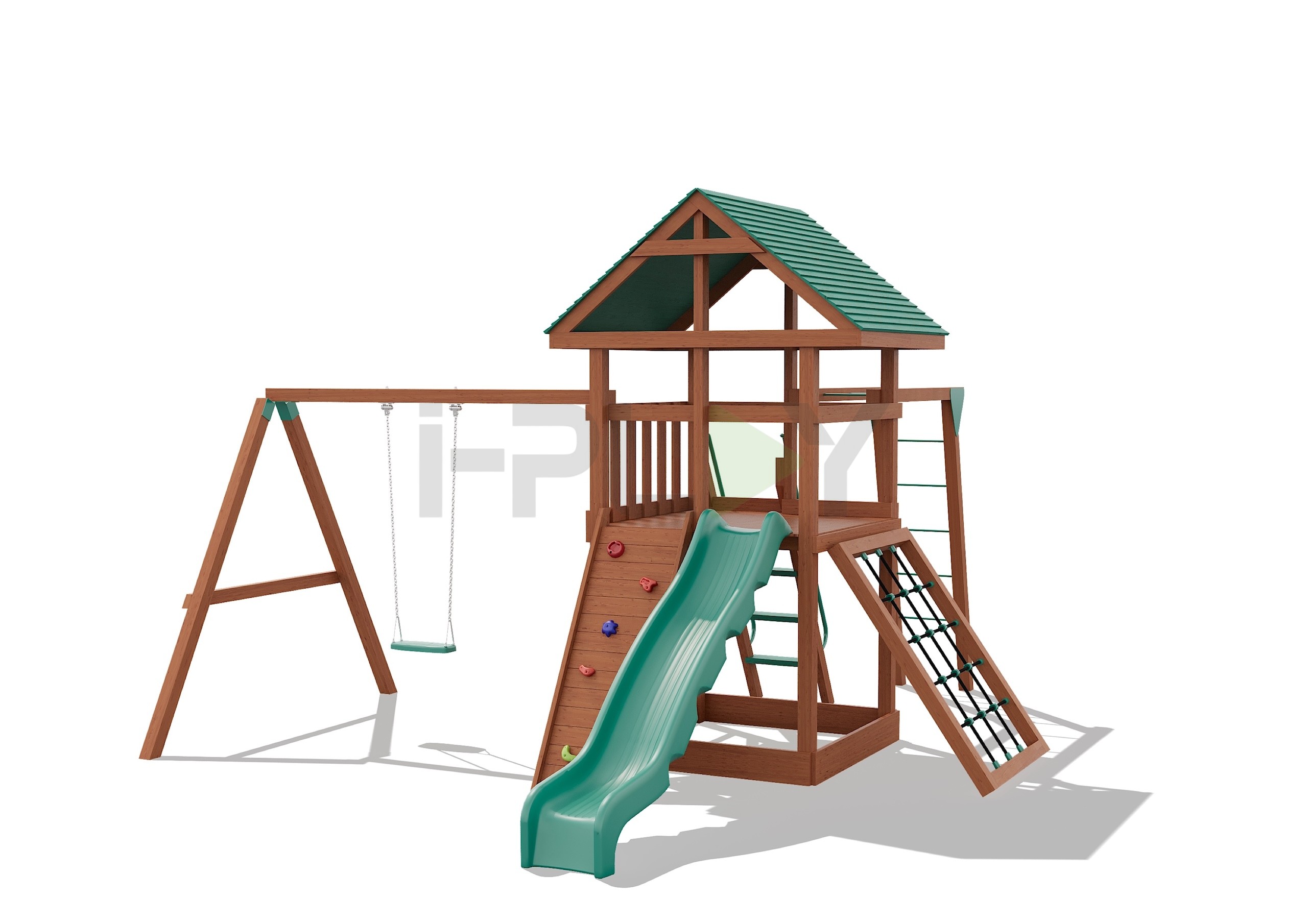Дерево клееный брус сосна, двухслойная пропитка на водной основе. Горка пластик HDPE. Цепь нержавеющая/оцинкованная сталь. Армированный канат.