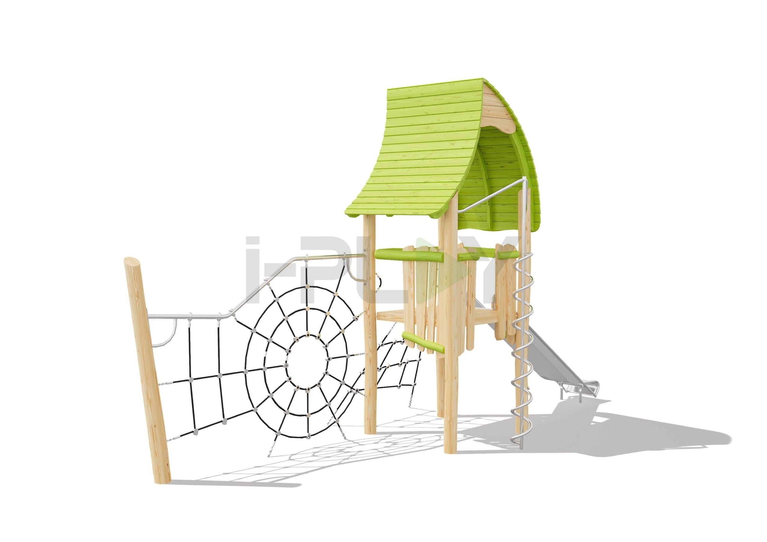 Дерево робиния (акация), двухслойная пропитка на водной основе. Полипропиленовый армированный канат 16 мм, горка нержавеющая сталь.