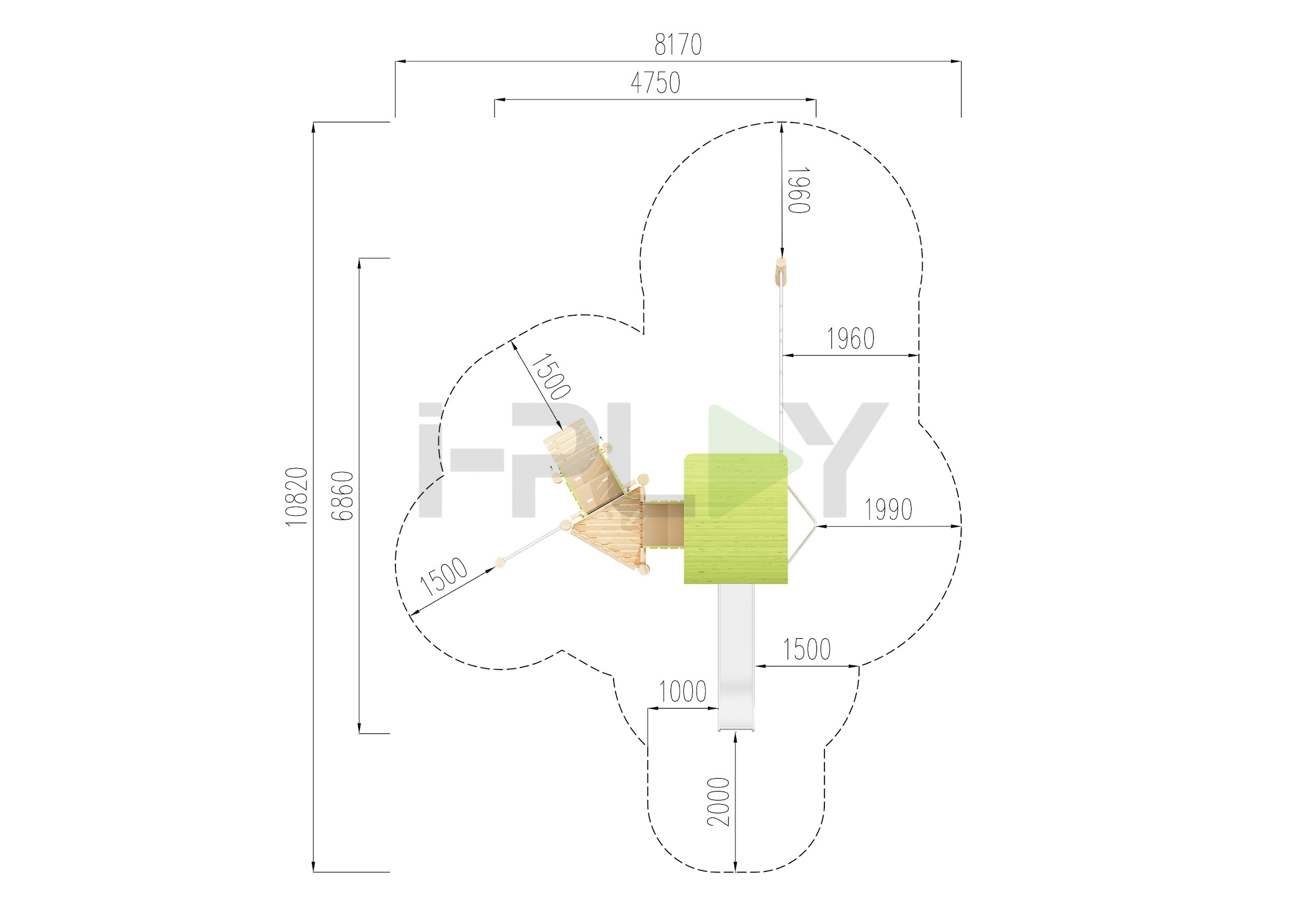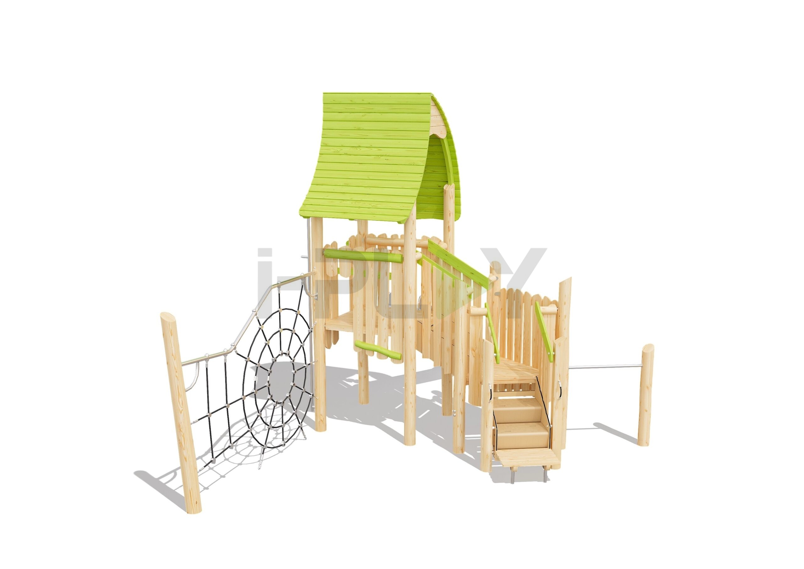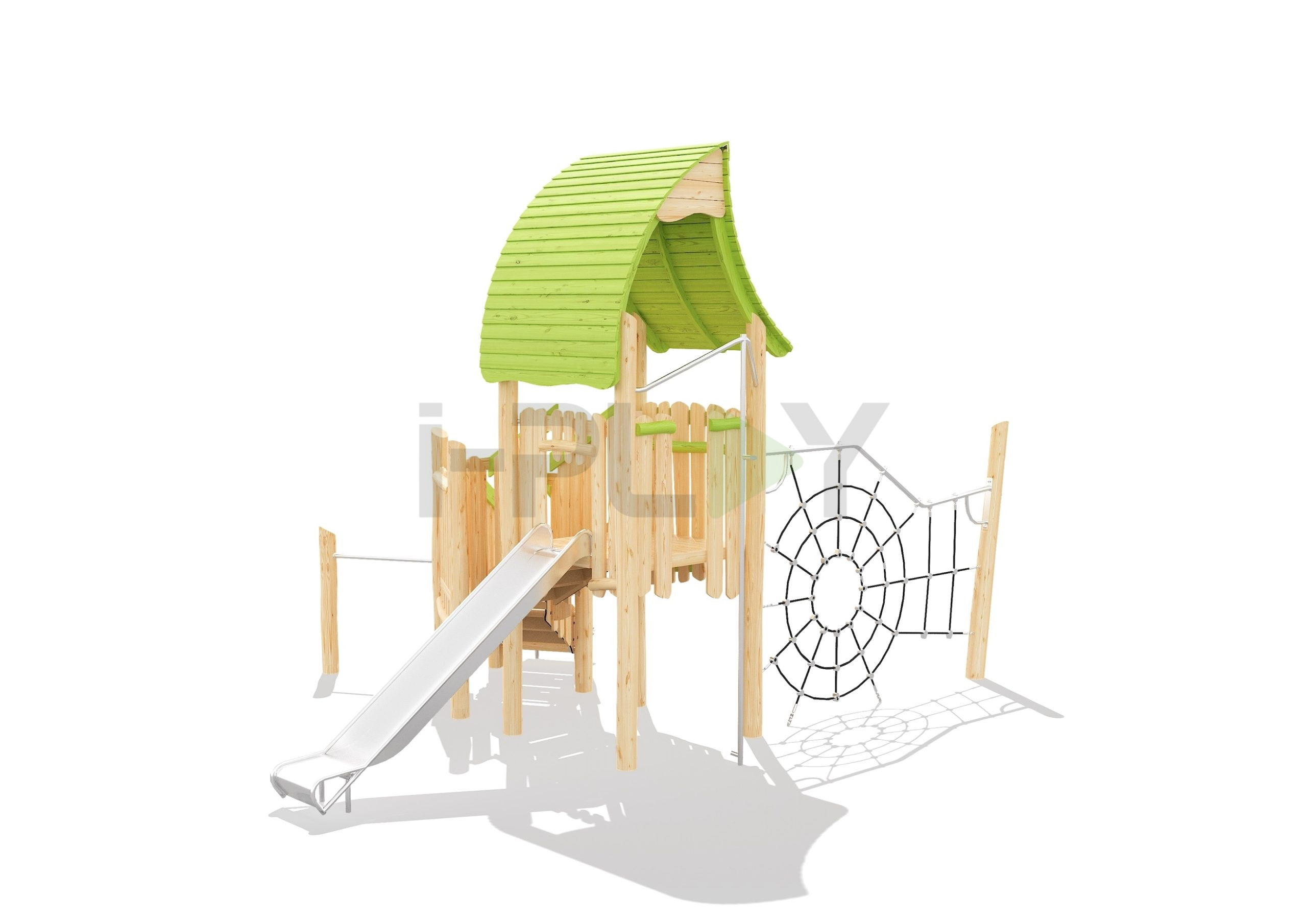 Дерево робиния (акация), двухслойная пропитка на водной основе. Полипропиленовый армированный канат 16 мм, горка нержавеющая сталь.