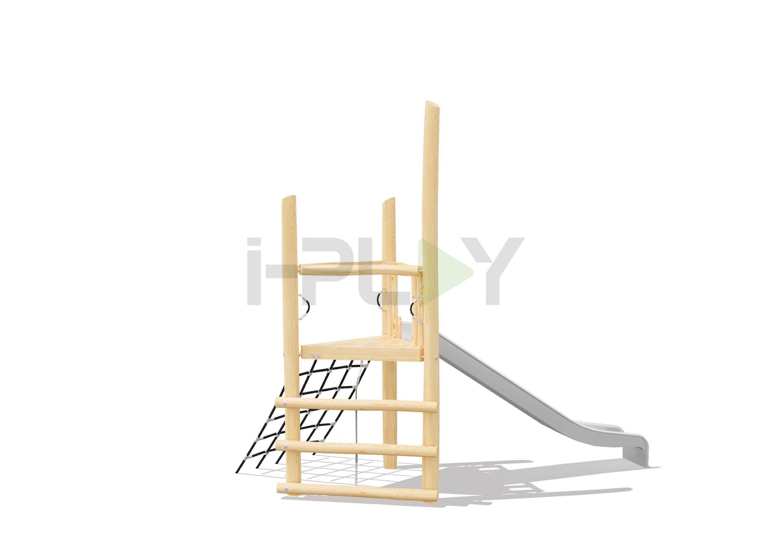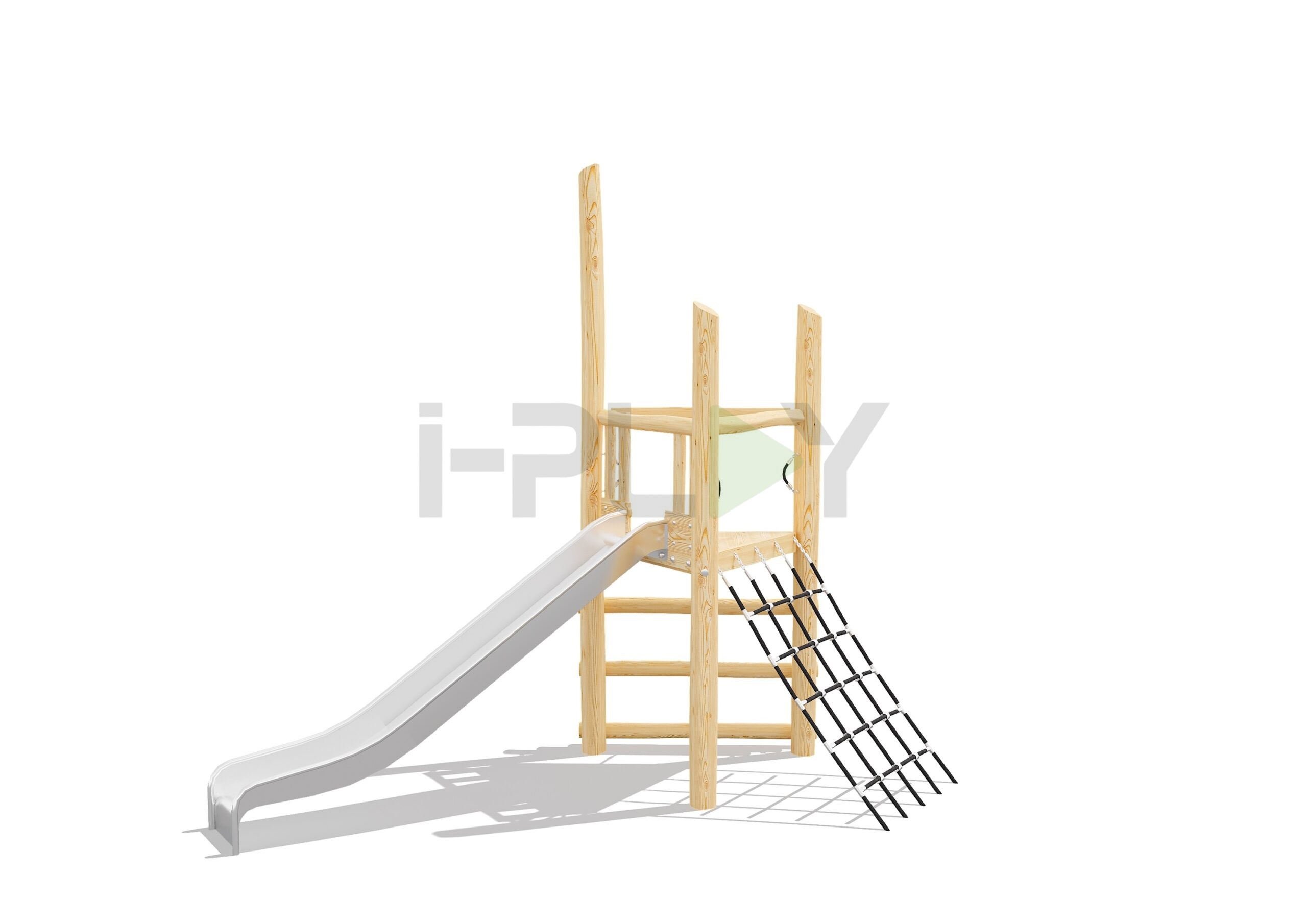 Дерево робиния (акация), двухслойная пропитка на водной основе. Полипропиленовый армированный канат 16 мм, горка нержавеющая сталь.