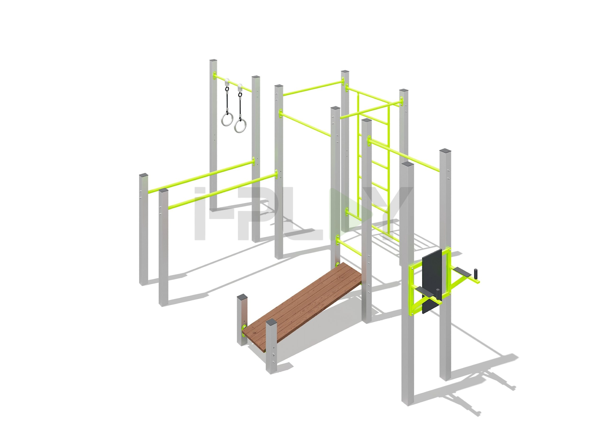 4 перекладины, шведская стенка, брусья, наклонная скамья, перекладина с кольцами, стойки для пресса